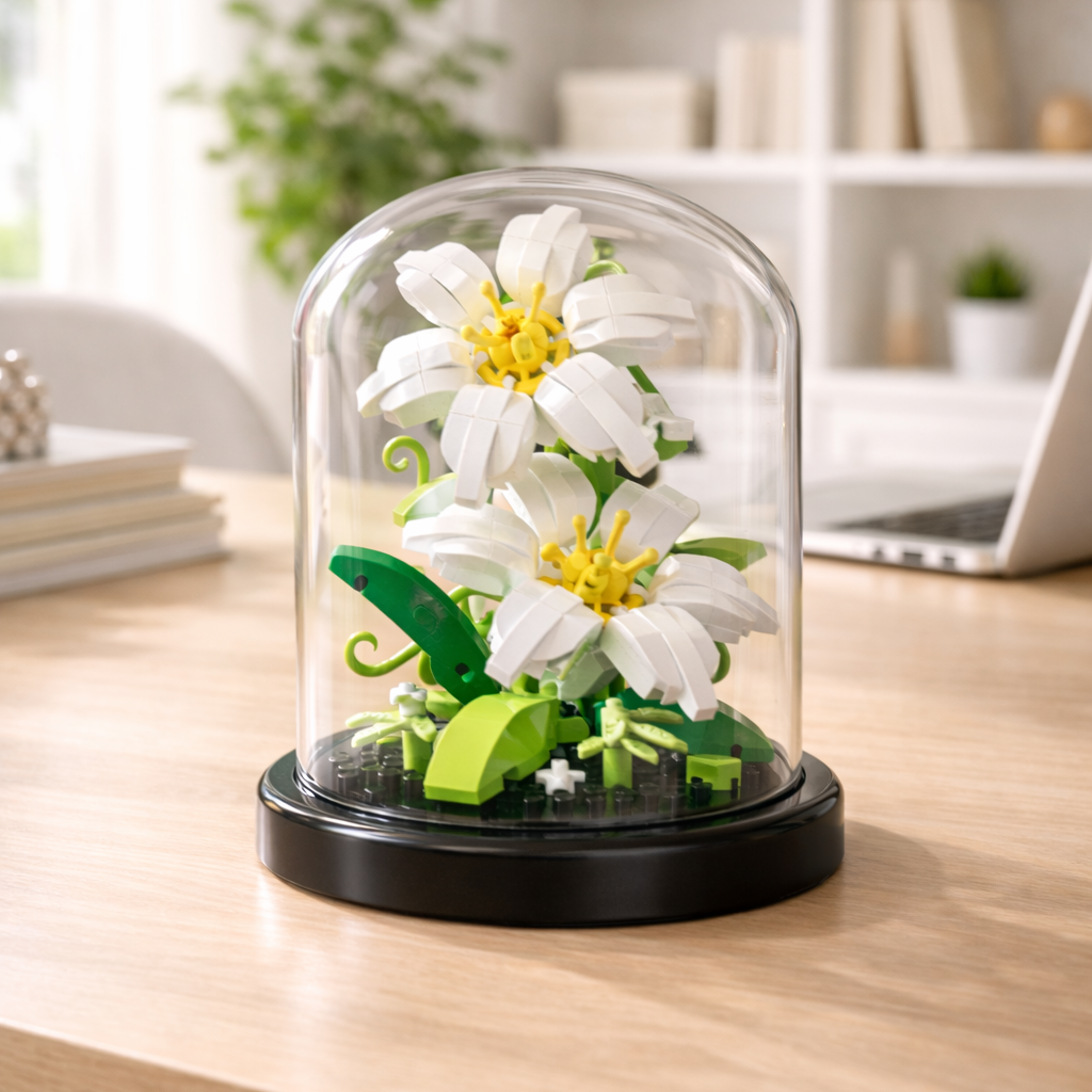 Optez pour un moment créatif avec ces lys blancs sous cloche à construire. Une activité manuelle et ludique qui se transforme en décoration durable.